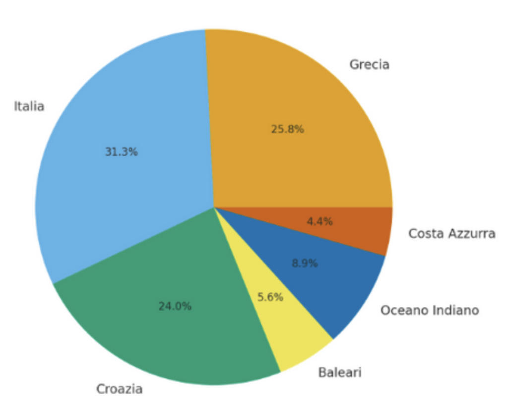 Le destinazioni mostrano trend contrastanti: Grecia, Pacifico e Caraibi sono in lieve calo, mentre Baleari, Costa Azzurra e Oceano Indiano crescono in media del 25%. Il podio resta invariato con Italia, Grecia e Croazia. In Italia, calano Sicilia e Sardegna, mentre Costa Amalfitana e Toscana registrano un forte aumento.