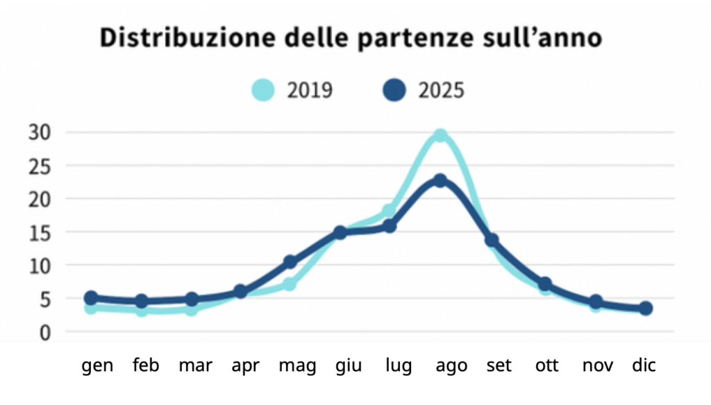 Rispetto al 2019, GlobeSailor rileva un calo del -10% nelle partenze a luglio e agosto. Mentre nel 2019 le vacanze estive rappresentavano il 48% delle partenze annuali, oggi ne rappresentano solo il 38%.